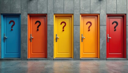 Five colorful doors with question marks. Each option represents a different life path or decision. Choosing the right door is a metaphor for finding answers and solutions.
