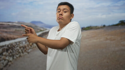 Man pointing finger on street beside stone wall, white t shirt, casual pose and neutral expression; skepticism suggestion.