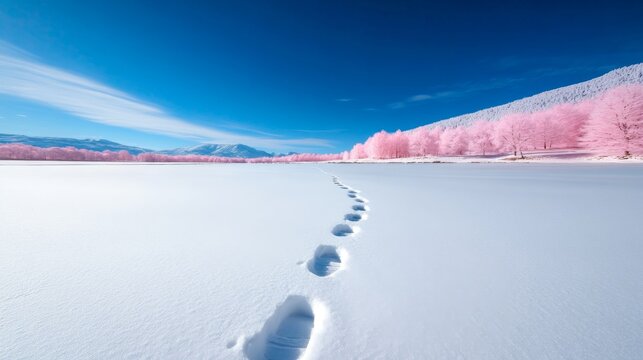 Infrared photograph of a winter landscape showing animal tracks in the snow.