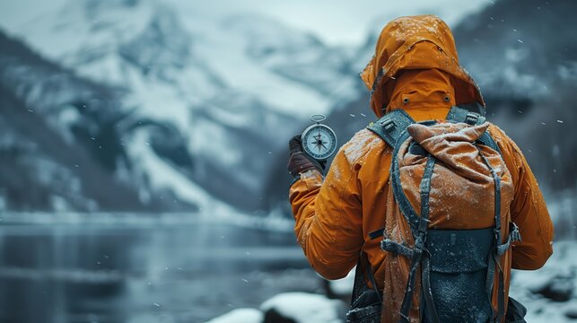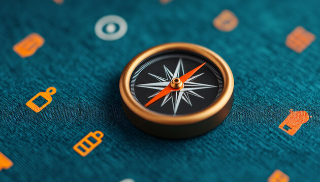 A close-up of a compass on a textured surface featuring various icons, symbolizing navigation and exploration.