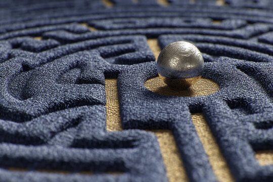 Textured blue maze with golden path, featuring a silver sphere at a decision point, symbolizing problem-solving, challenge, or pathfinding concepts