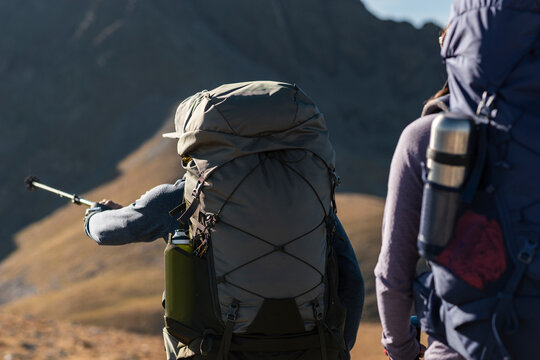 Pathfinding hiker signaling direction across open mountain terrain