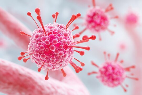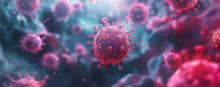 Close-up of virus particles floating in microscopic view, colored in pink and blue hues, representing pathogens or cells in biological environment