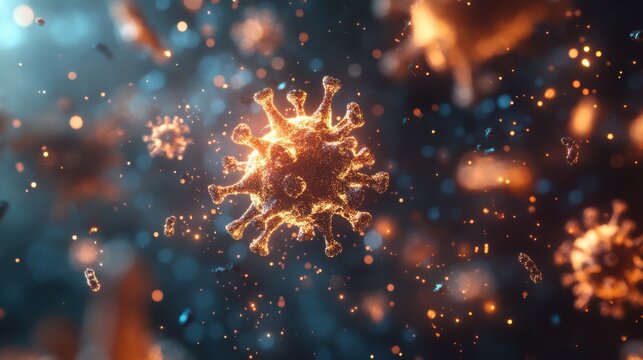 Glowing bacteria and viral particles floating in the air in a vibrant blue and green color palette for a medical concept