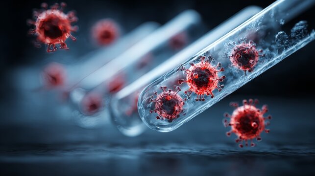 Medical technology scientist holding test tube with virus particles floating blue liquid