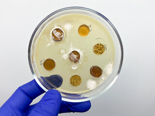 Petri dish on gray background, bacteria germinated on agar columns in Petri dish