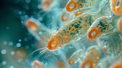 Listeria monocytogenes bacteria on raw fish, light blue-emerald green, beautiful biology.