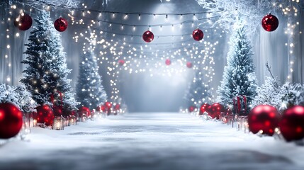 Beautiful winter wonderland pathway decorated with Christmas ornaments and lights during the holiday season