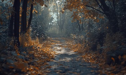 Tranquil forest path lined with golden autumn leaves, illuminated by soft sunlight filtering through the trees in a peaceful setting