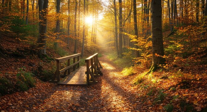 Serene autumn forest pathway with wooden bridge and sunlight filtering through trees at dawn or dusk with serene landscape and fall foliage and peaceful atmosphere