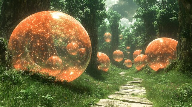 Sunlight illuminating mystical forest pathway with vibrant foliage