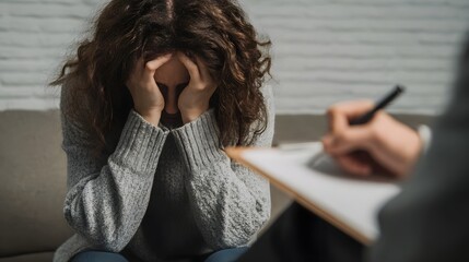 Distressed woman in therapy session receiving support