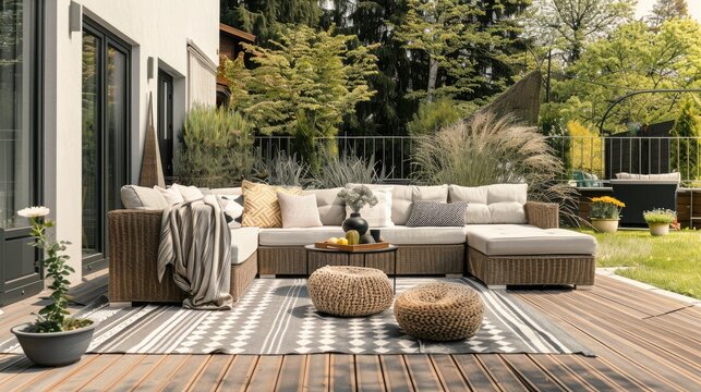 A chic patio with comfy seating and a modern coffee table amid tranquility