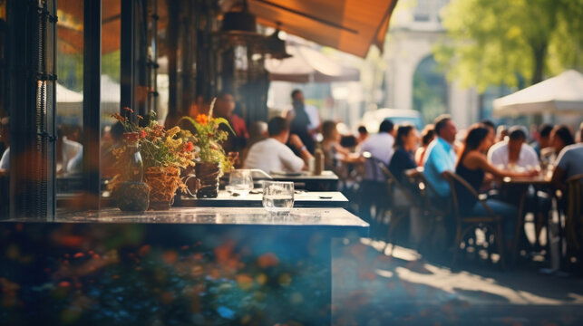An outdoor restaurant patio bustles with diners enjoying meals and conversation in the warm, glowing sunlight of the day.