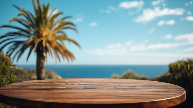 Round wooden table overlooking a serene ocean view under a clear sky with palm trees in the background