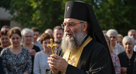 Orthodox bishop holding a cross during Dormition of the Mother of God celebration for use in religious blogs, church websites, presentation slides, and awareness campaigns