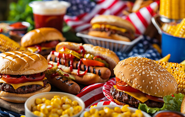 4th of July USA festive table with burgers, hot dogs and corn on the cob. American national holiday concept.