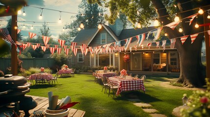 A festive backyard picnic setup for celebrating the 4th of July with red, white, and blue decorations. Ideal for holiday, outdoor party, and patriotic themes. Generated AI