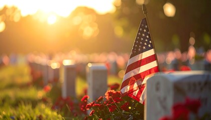 A cemetery is bathed in the warm glow of the setting sun. The American flag waves proudly over rows of headstones. Red flowers adorn the graves