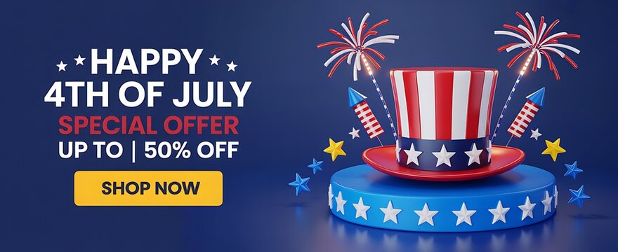 4th of july special offer banner with patriotic hat and fireworks on blue background