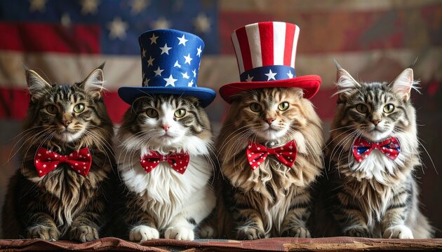 Four adorable cats dressed in patriotic Uncle Sam hats and bow ties pose side by side, celebrating in red, white, and blue.