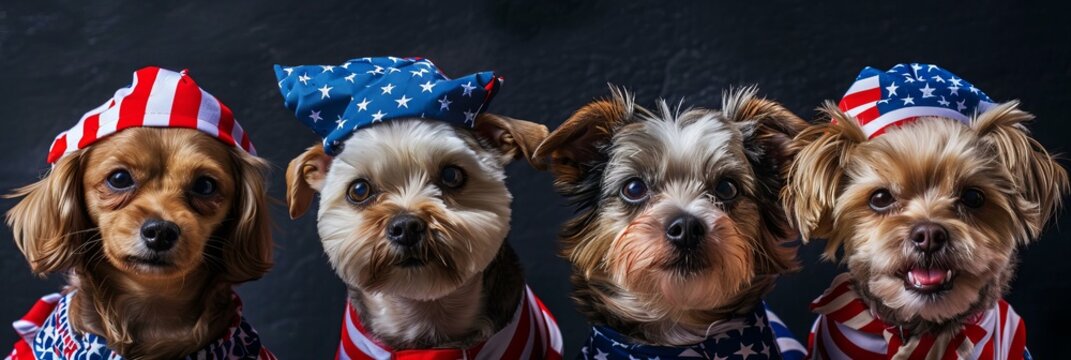 Two dogs wear patriotic hats and sunglasses, posing happily in a festive setting adorned with red, white, and blue decorations.