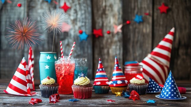 Festive cupcakes and drinks for the 4th of july celebration on wooden surface
