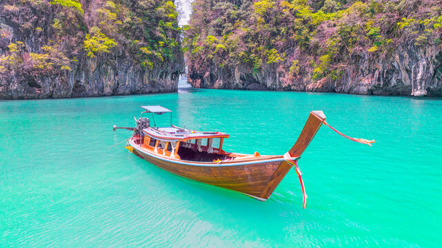 Tourist long tail boat Landed on a peaceful beach, clear water, surrounded by hills of Koh Phi Phi, Thailand