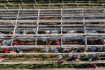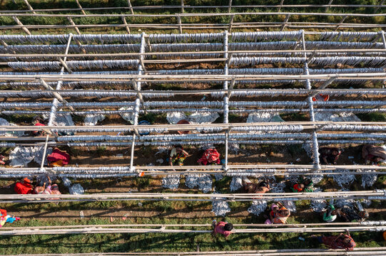 Aerial view of women working beneath a grid of bamboo racks, their colorful clothing contrasting with the drying fish, Chattogram, Chittagong Division, Bangladesh.