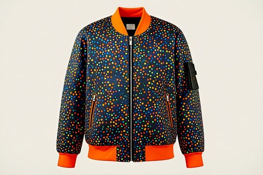 Stylish bomber jacket with colorful abstract pattern and orange accents