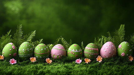 Vibrantly decorated Easter eggs  Arranged on Green Background with Flowers