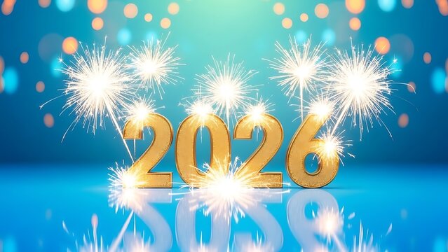 Sparkling gold numbers 2026 with fireworks on blue background with bokeh lights
