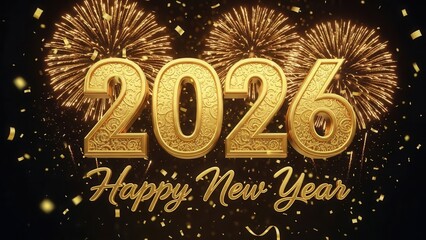 Golden 3d numbers 2026 with floral patterns and fireworks on black background