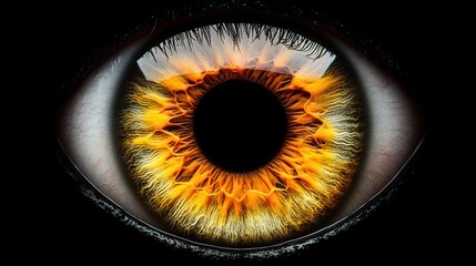 Macro amber iris holding focused gaze with crisp lashes, tear film and specular highlights
