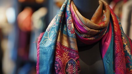 A close-up view of a colorful patterned scarf draped over a mannequin.