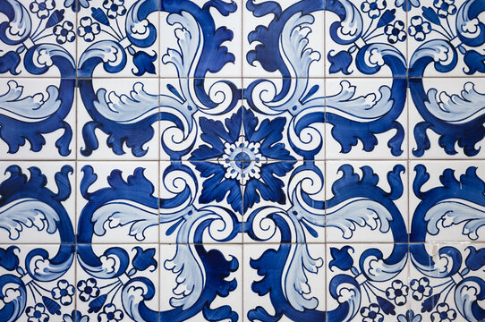 Detail texture of blue and white wall tiles typically for Portuguese cities like Porto or Lisbon