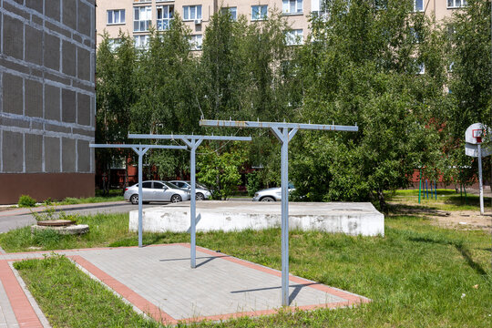 Outdoor metal drying racks installed on paved area in residential courtyard with apartment buildings and trees in background.