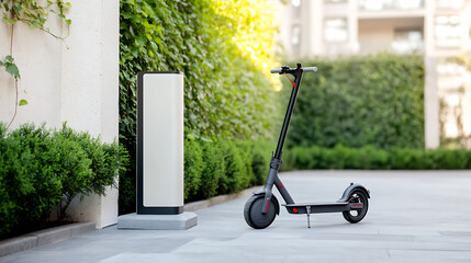 A woman walks confidently along a paved path in a contemporary residential area. She wears a stylish outfit with a sweater tied around her shoulders and carries a bag.
