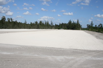Empty paved area at sunset. Soft, pastel-colored clouds fill the sky above a flat expanse of light gray paving stones