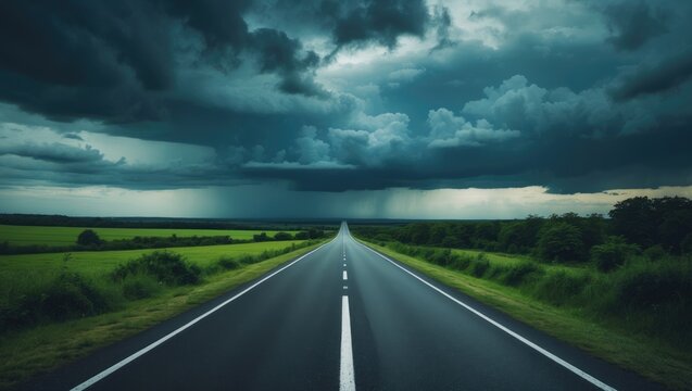 A paved highway in the countryside stretches towards the horizon under a gray sky, suggesting an outdoor scene filled with storm anticipation.