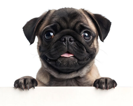 A cute pug puppy with big eyes and tongue sticking out peering over a white surface looking at the viewer