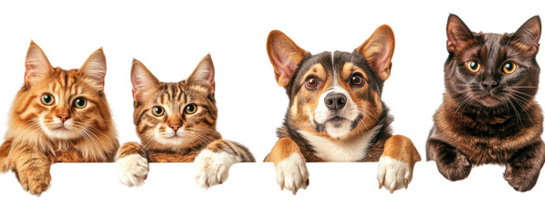 Two cute tabby cats and a dog, along with a black cat, pose over a blank white sign happily.