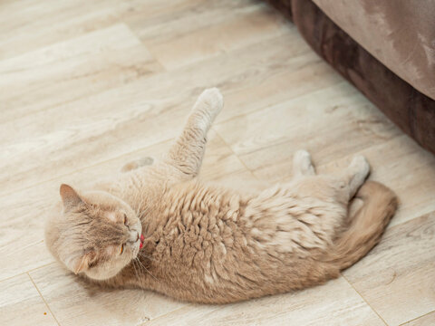Adorable folded ear cat curiously peeking over a table in a realistic photograph