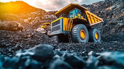 A vibrant close-up of a mining truck loaded with coal, showcasing the machinery and equipment essential for the coal mining process.