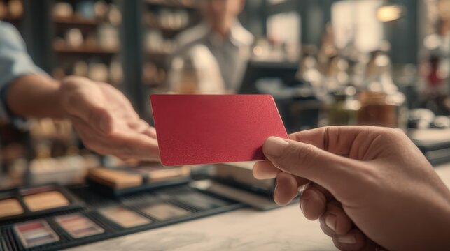 A close-up of a person's hand, giving a red card to a barista in a cozy café setting.