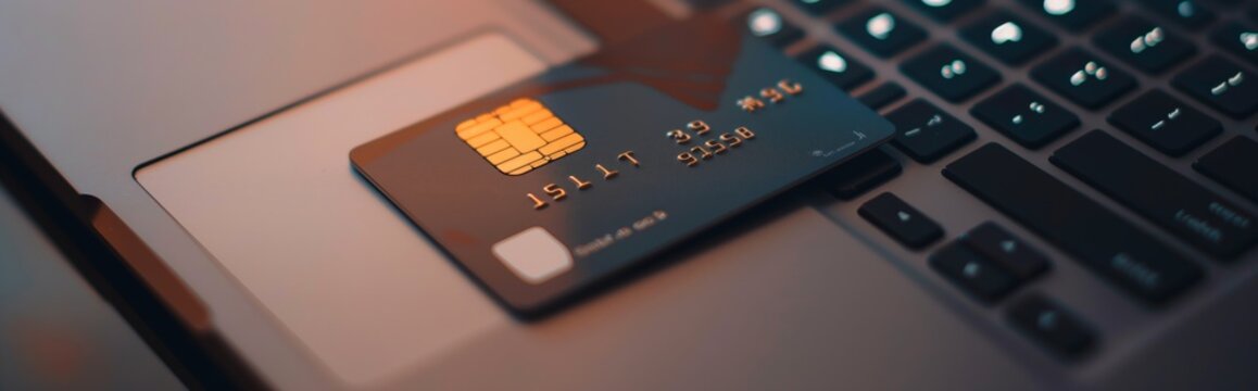 A card with a chip lying next to a laptop, symbolizing online payments