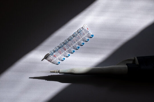 Lab doctor holding glass test tube for analysis. The hands  in gloves of a healthcare worker pipetting samples for pcr testing.
