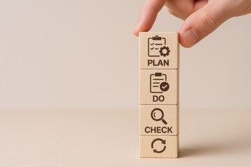 Pdca wooden blocks illustrating plan, do, check, act cycle