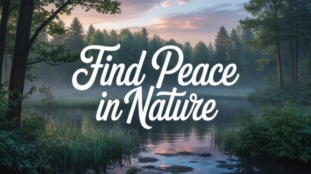 Forest lake scene with trees, calm water, grass and stones under soft daylight, mist above the surface, and large white text reading “Find Peace in Nature” placed over the landscape.