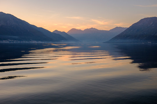 Luxury yachts docked in picturesque bay at sunset in montenegro